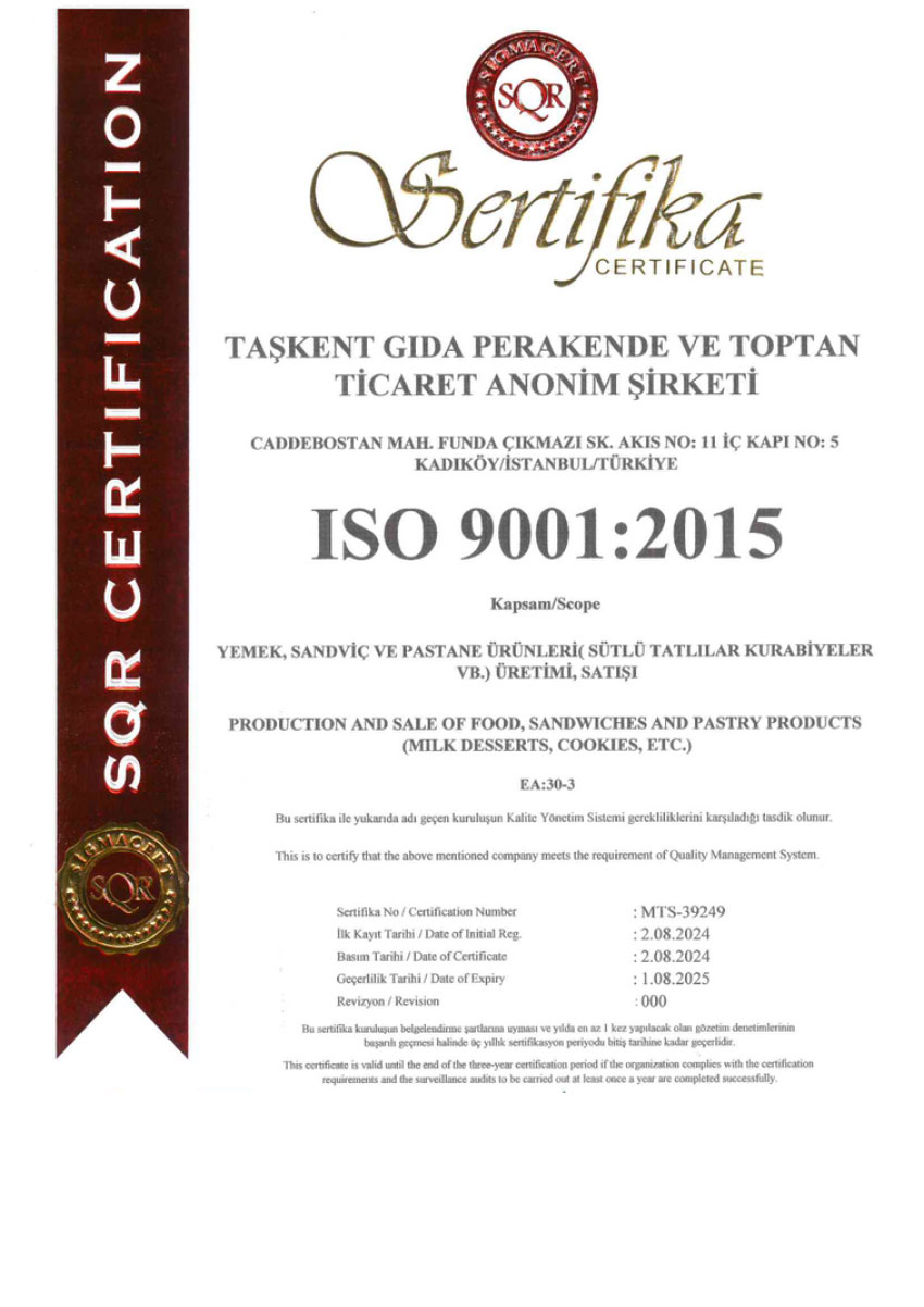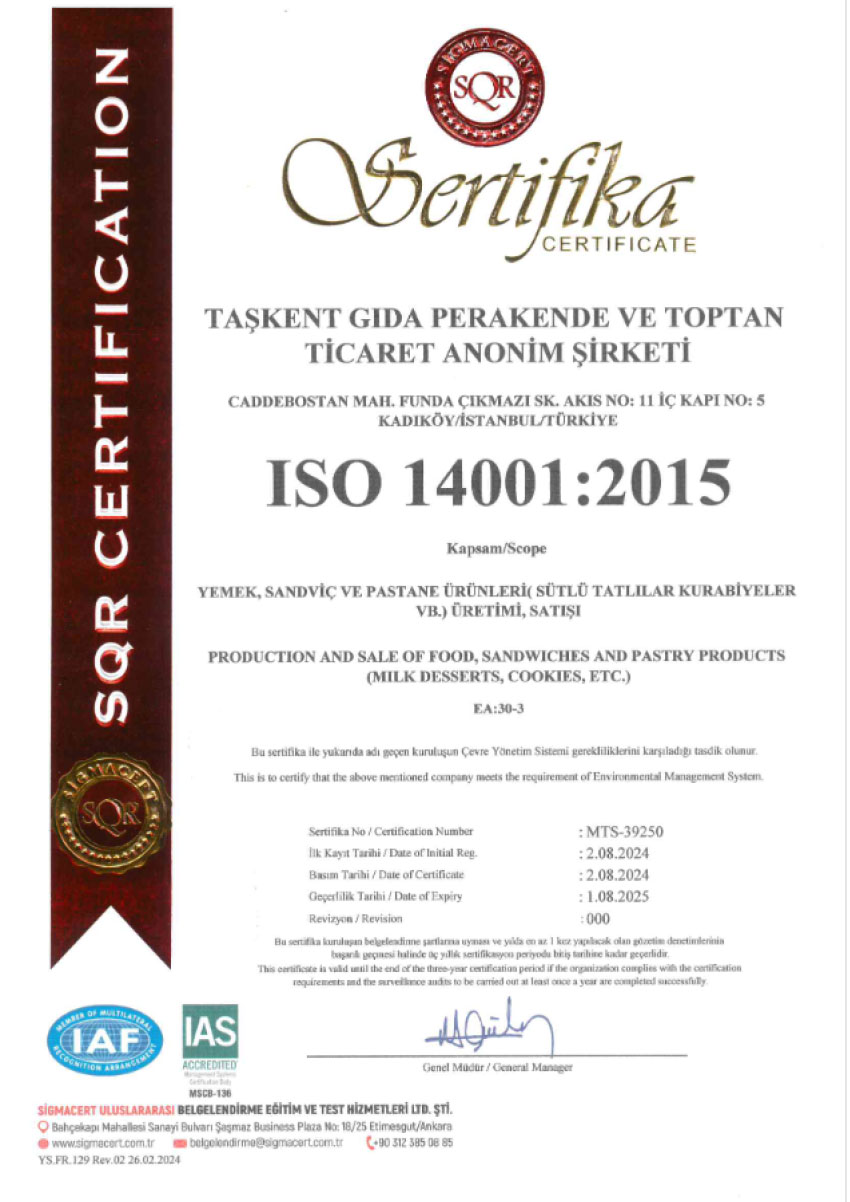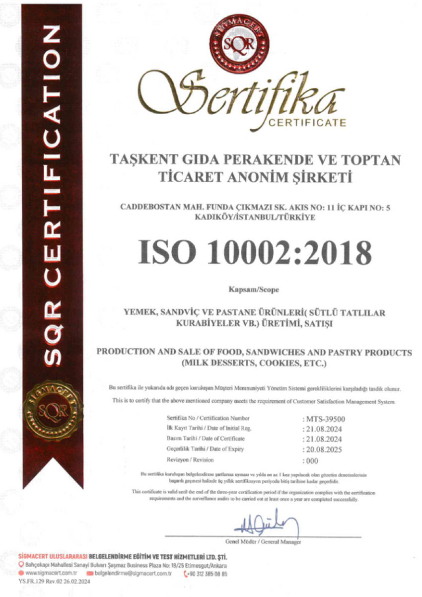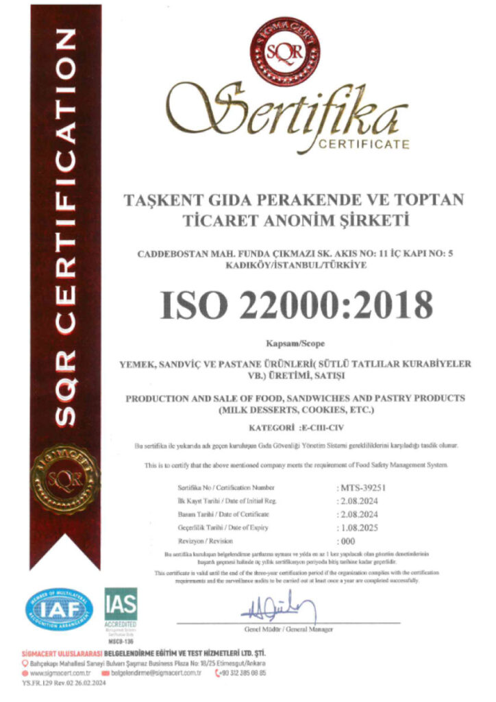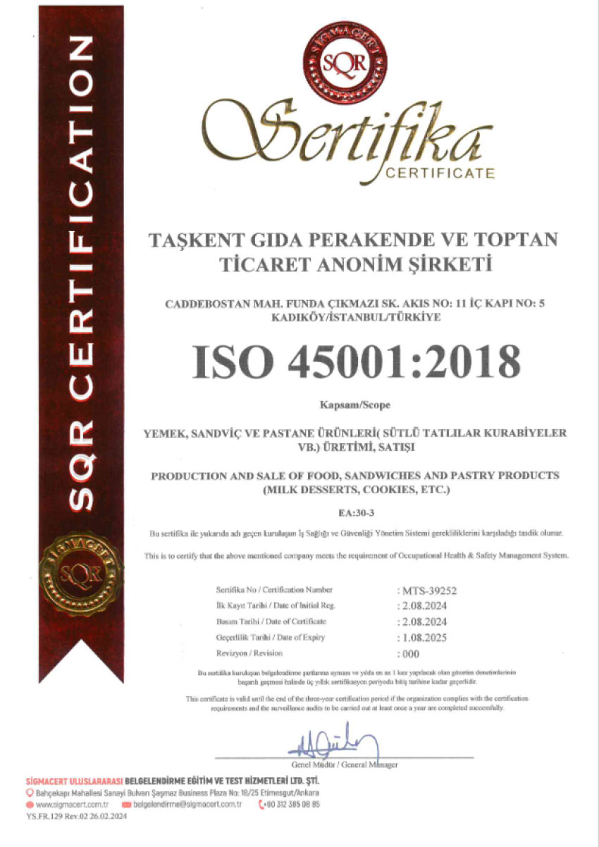 In our facility, home-cooked meals, dough production, bakery production, and sandwich production areas are positioned separately to prevent cross-contamination. All production stages are carried out under the supervision of a food engineer, in compliance with food safety, general hygiene, and personal hygiene rules (such as wearing hairnets, sleeves, masks, and gloves). Our goal is to offer healthy, reliable, and delicious alternatives to our consumers. All personnel in the production and service areas receive training in areas such as professional development, food safety, environmental management, and customer satisfaction, in accordance with legal regulations, and provide high-quality service.